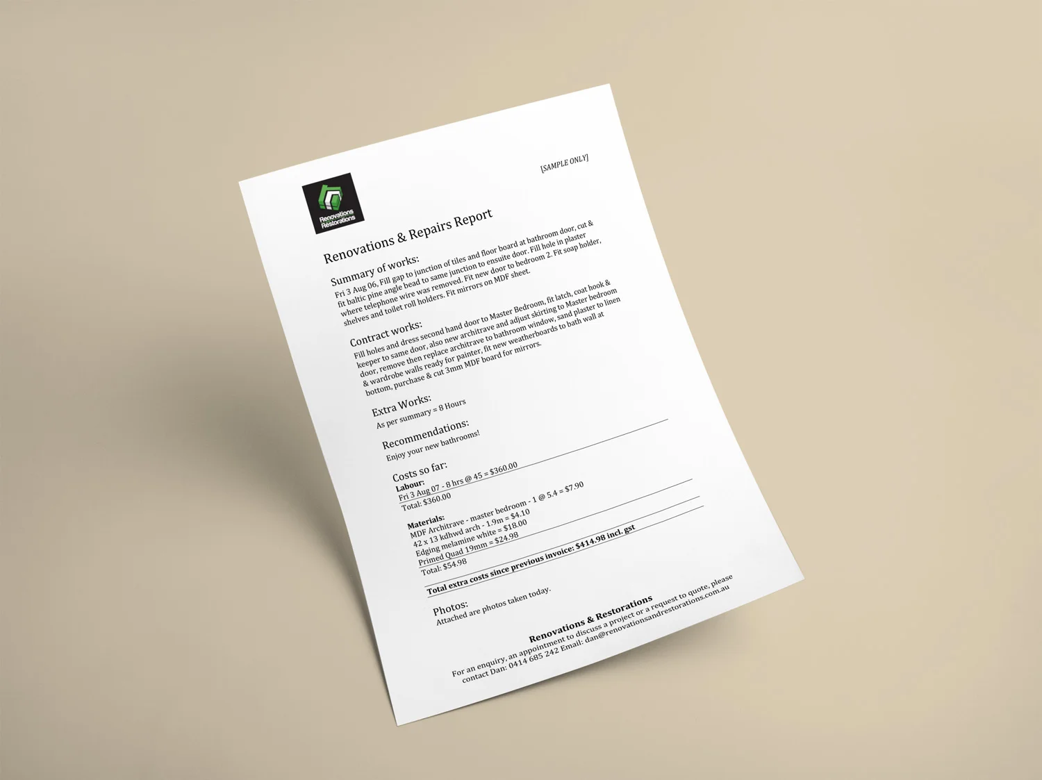 This is our usual format for a report on works which could be emailed to you if requested or if deemed necessary by Renovations & Restorations.